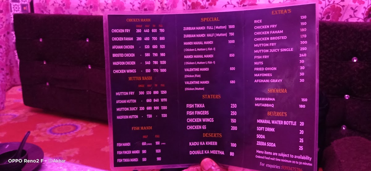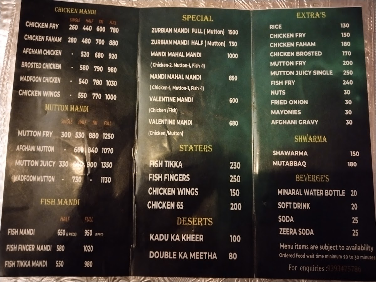 Introducing the menu at Mandi Mahal, located in Khammam, offers a thrilling dive into the world of Mandi, an iconic dish rich in flavors. The menu showcases a variety of tantalizing options, including the fragrant Chicken Mandi, Faham—a standout favorite among patrons—alongside Brosted and Afghani Chicken. Fish lovers can indulge in selections like Fish Mandi and Fish Tikka Mandi, ensuring that there's something for everyone.